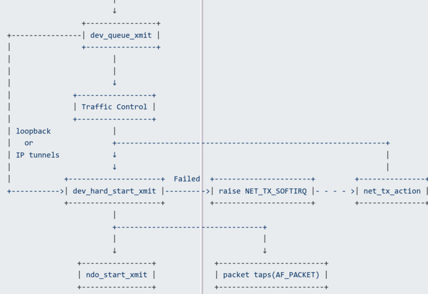 调用它的函数会把skb放到一个地方,然后抛出软中断NET_TX_SOFTIRQ,交给软中断处理程序net_tx_action稍后重试(如果是loopback或者IP tunnels的话,失败后不会有重试的逻辑)