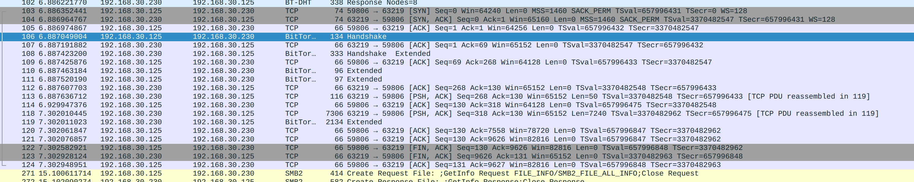 • 结果: 标准握手完成。双方确认了对方身份和意图(针对同一个 info_hash),并且都知晓对方支持扩展协议。